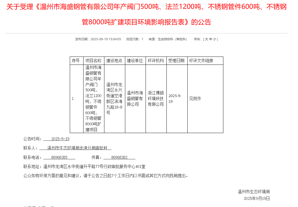 2025年9月19日,溫州市生態環境局受理溫州市海盛鋼管有限公司年產閥門500噸、法蘭1200噸、不銹鋼管件600噸、不銹鋼管8000噸擴建項目環境影響報告表并對外進行公告,公告期:7個工作日。
