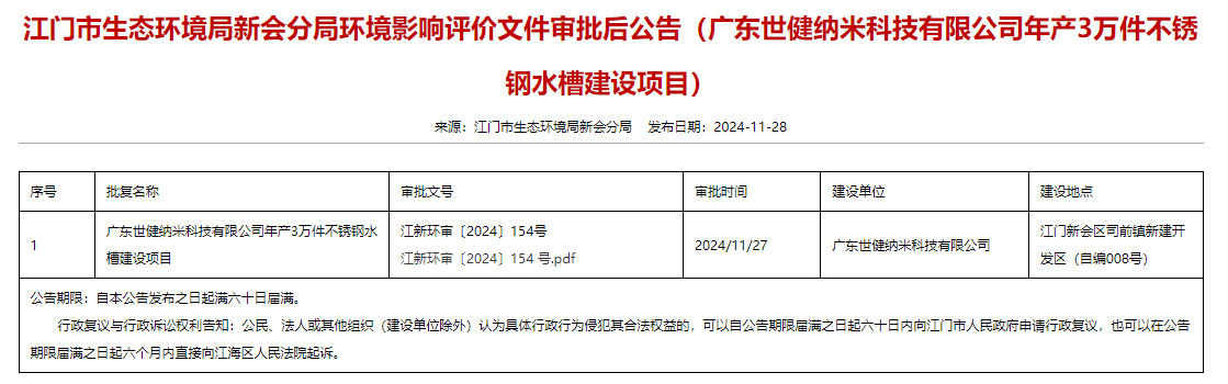 2024年11月28日,江門(mén)市生態(tài)環(huán)境局新會(huì)分局就廣東世健納米科技有限公司年產(chǎn)3萬(wàn)件不銹鋼水槽建設(shè)項(xiàng)目環(huán)境影響評(píng)價(jià)文件作出審批意見(jiàn)并對(duì)外進(jìn)行公告,公告期限:自本公告發(fā)布之日起滿(mǎn)六十日屆滿(mǎn)。