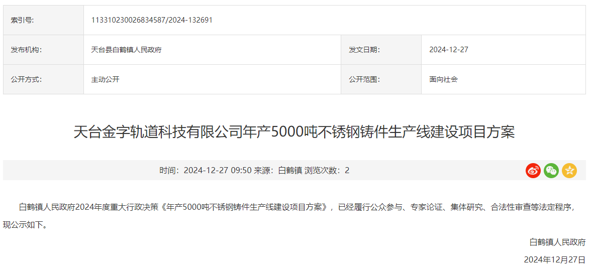 2024年12月27日,白鶴鎮人民政府就天臺金字軌道科技有限公司年產5000噸不銹鋼鑄件生產線建設項目方案對外進行公示。